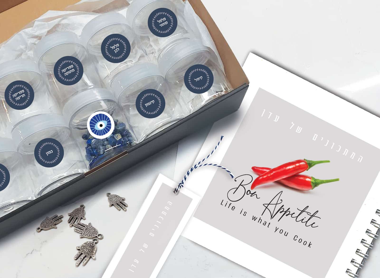 עם מדבקות מעוצבות עם שמות התבלינים.